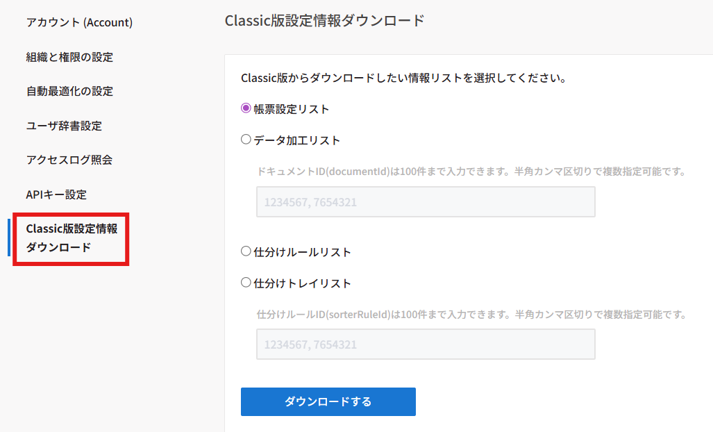 DX Suite Classic版から現行のDX Suiteヘデータ移行する際に、Classic版設定情報ダウンロード機能を使うと、Classic版で設定した情報を一覧化でCSVダウンロードすることができます。