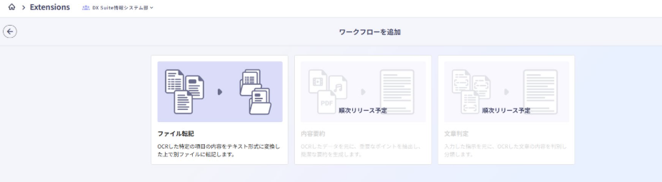 ファイル転記は、Extensionsのワークフローの一つです。読み取った結果を別のofficeファイルに書き写すことができます。アップロードするファイルが構造化されていなくても転記可能です。