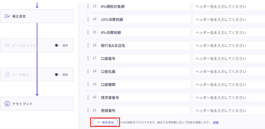 (項目数は、あらかじめ登録されている項目を含め、通常項目が500項目、明細項目が30項目(列)設定可能です。)