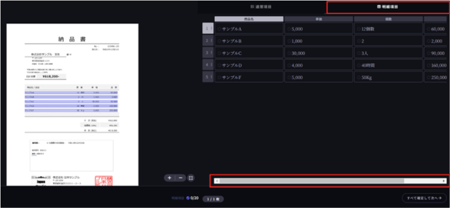 データチェック画面の「明細項目」にて、スクロールバーを表示しました。