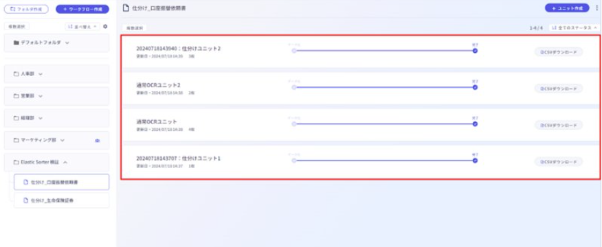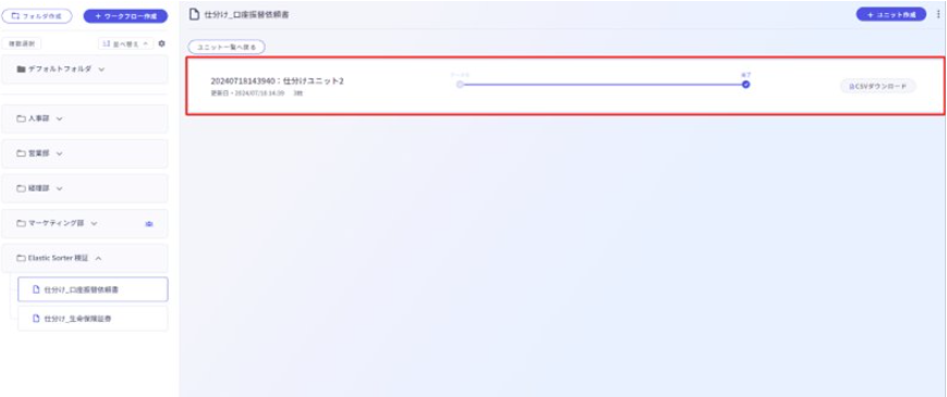 Elastic Sorter にて「仕分け開始」>「OCRに送信」>「仕分けトレイ」>「送信先ワークフローへ」を押下した際の遷移先画面にて、Intelligent OCR に送信したユニットのみ表示されるように変更しました。