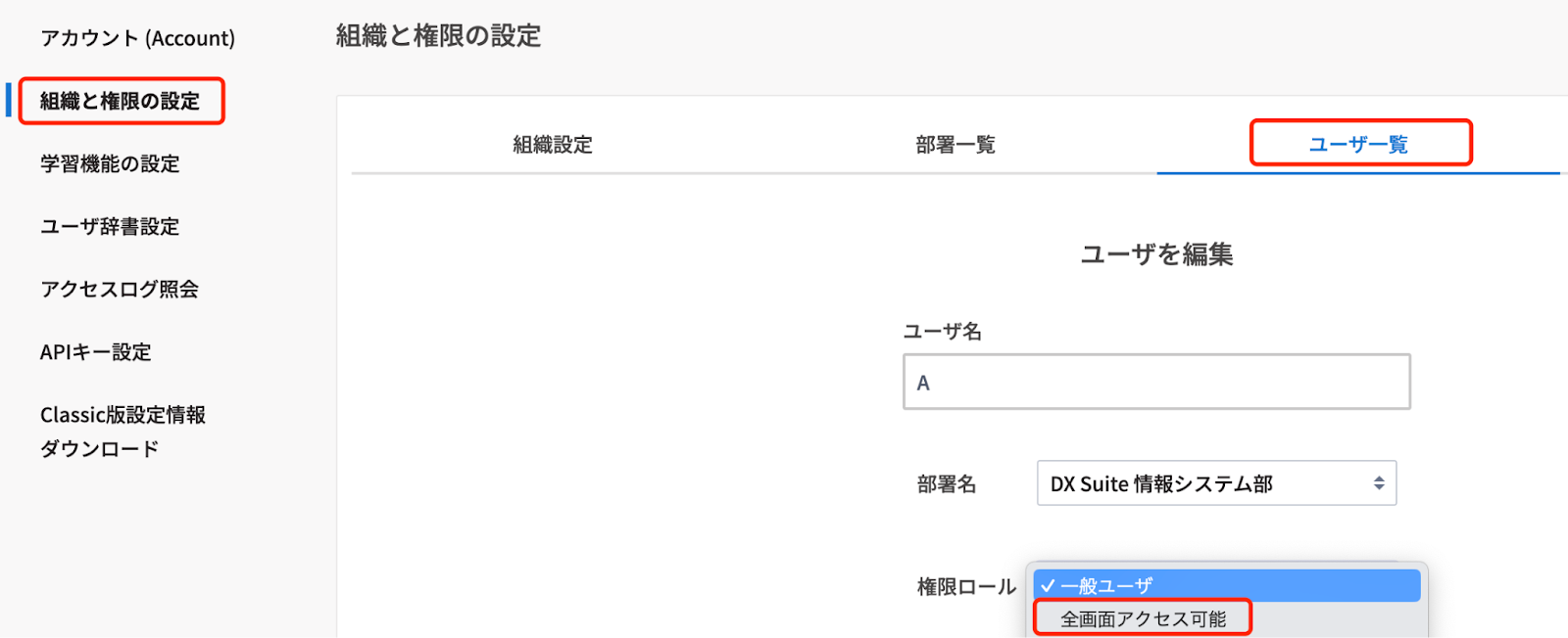 Aユーザの権限ロールを「一般ユーザ」から「全画面アクセス可能」へ変更します。