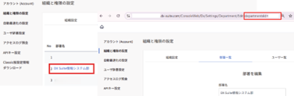 確認したい部署名をクリックし、部署名の編集画面に遷移後のURLから部署IDが確認できます。 https://xxx.dx-suite.com/ConsoleWeb/Dx/Settings/Department/Edit?departmentsId=xxxxx