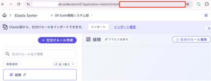 確認したい仕分けルールをクリックし、URLから仕分けルールIDが確認できます。 https://xxx.dx-suite.com/wf/?application=elasticSorter&sortConfigId=xxxx |