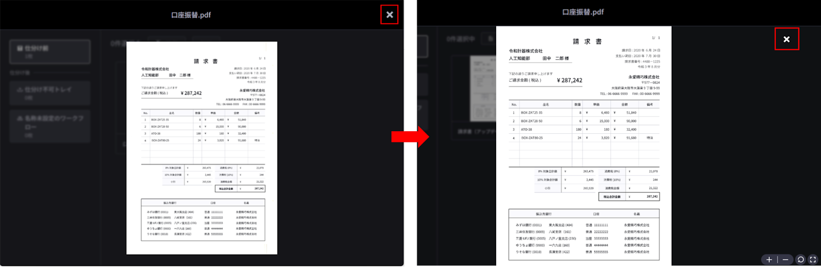 閉じるボタンをクリックした直後の画面で、誤って「OCRに送信」をクリックしてしまうことを防ぐため、閉じるボタンの位置をずらす変更をしました。