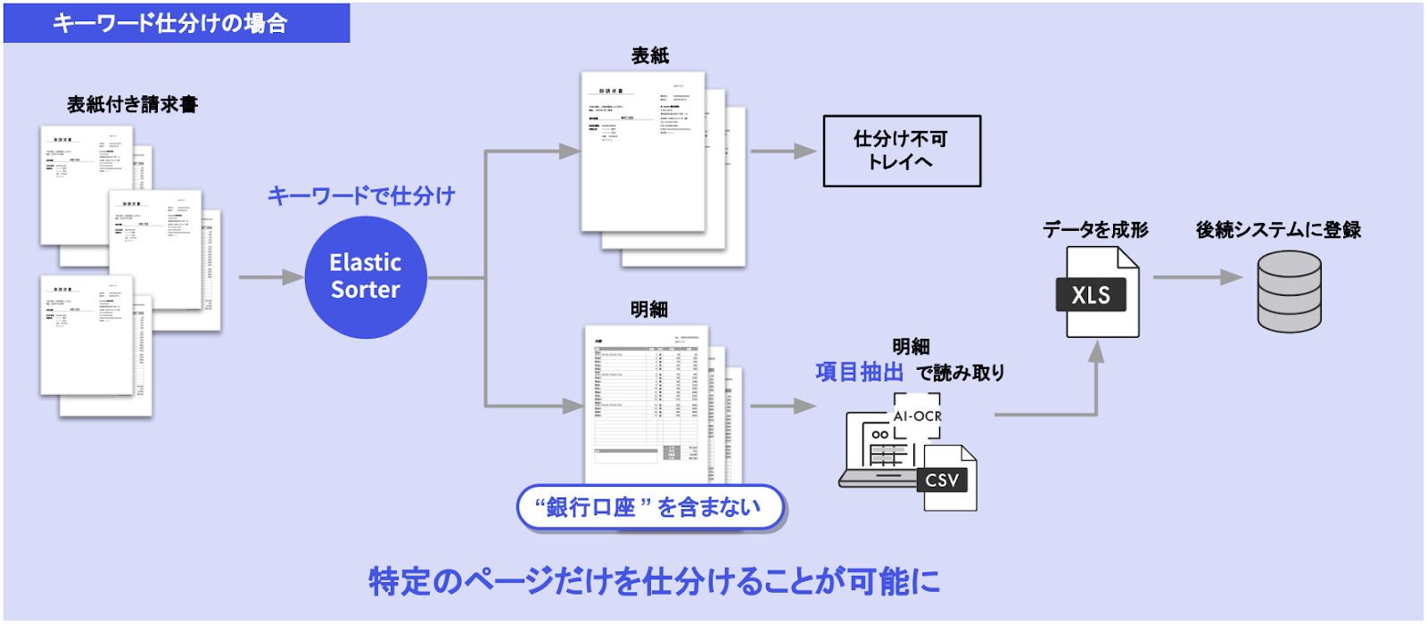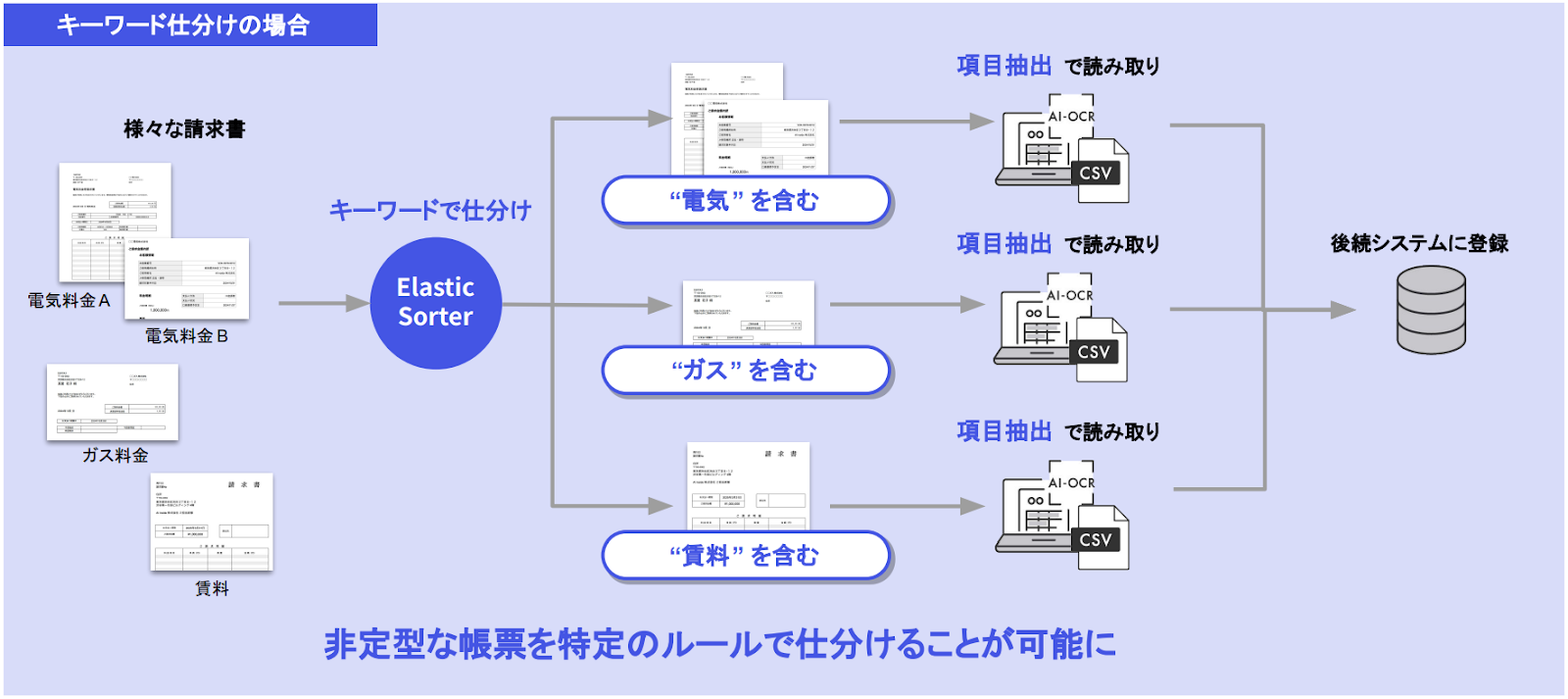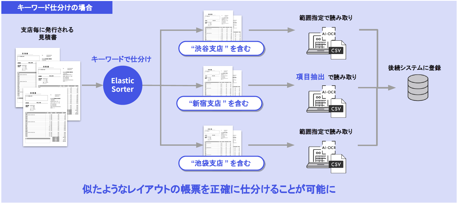 従来のElastic Sorter は、帳票のレイアウトに基づく仕分けが可能でしたが(以下、「レイアウト仕分け」)、新機能「キーワード仕分け」では、あらかじめ指定した「特定のキーワード」の有無で帳票を仕分けることができるようになりました。