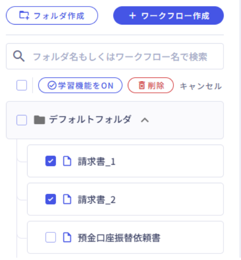 ワークフローを複数選択した際に、「学習機能をON」「削除」を一括で操作できる機能を追加しました。