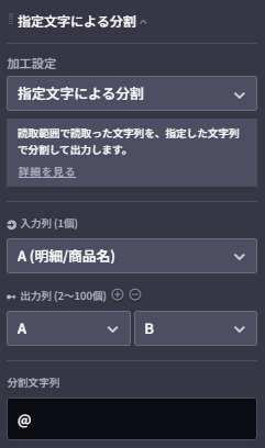 「指定文字による分割」で「@」以降を別の列に出力する加工を設定します。