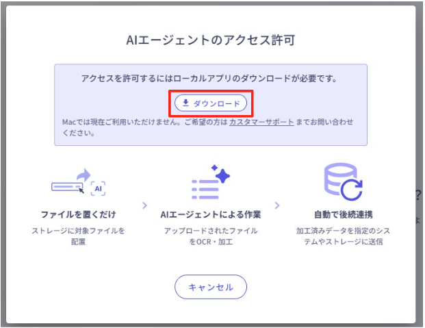 AIエージェントにローカルストレージ連携を許可し、アップロード/ダウンロードを自動化するためには、ローカルアプリ(DX Suite Agent App)のダウンロードおよび初期設定が必要です。