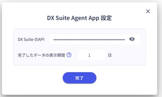 「DX Suite Agent App 設定」が表示され、APIキーの確認や、データ表示期間の設定を行うことができます。