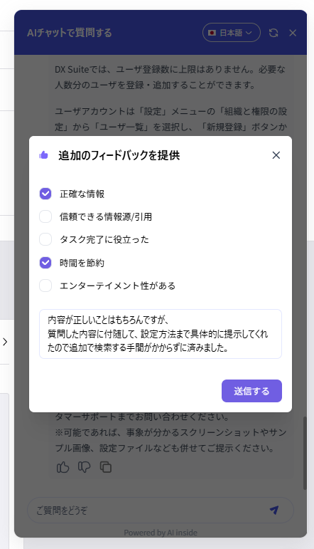 ※AIチャットの後に問い合わせフォームをご利用の際は、AIとのやりとり内容も併せてご記載いただくと、より適切なサポートを提供できます。