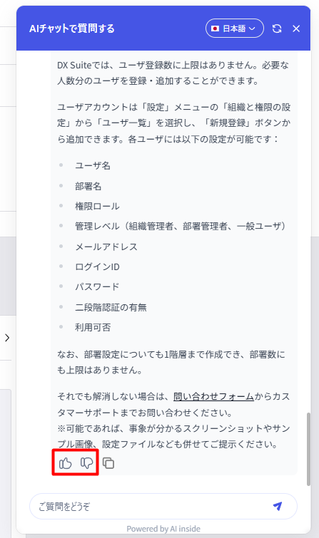 テスト導入のため、初期段階では回答精度が十分でない場合がございます。お客様のフィードバックをもとに順次改善してまいりますので、各回答の後に表示されるGood/Badボタンより評価をお聞かせください。
