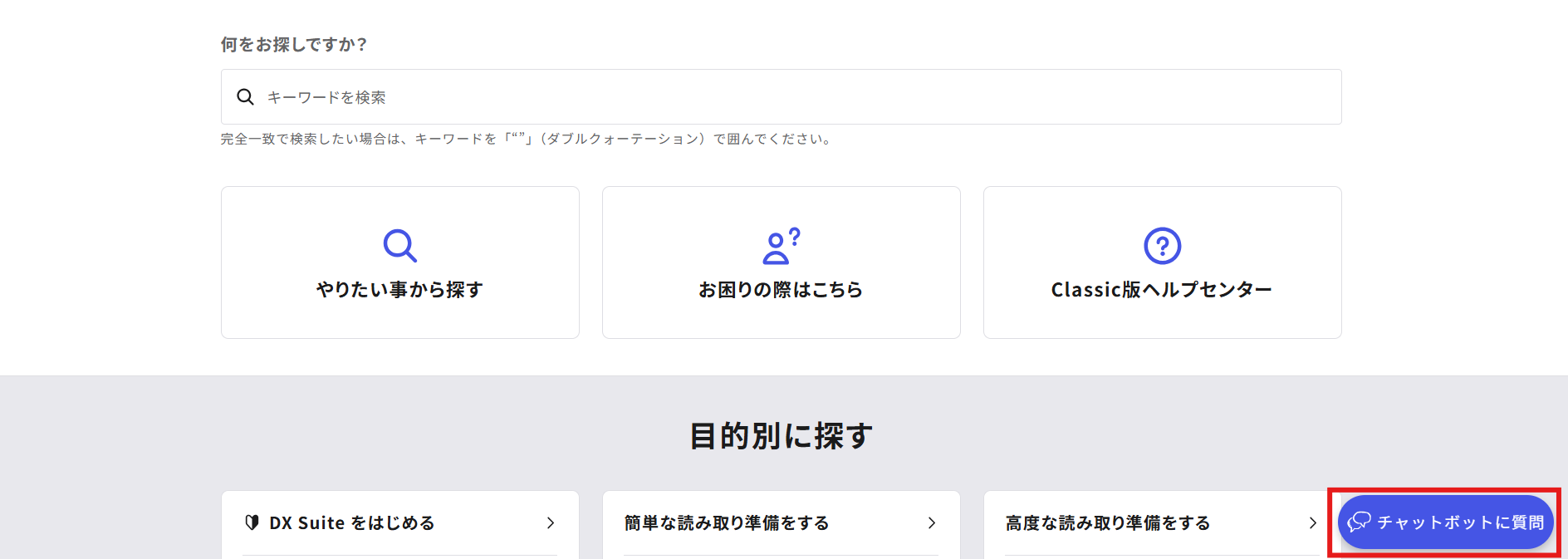 AIチャットは、ヘルプセンタートップページ右下に表示される「チャットボットに質問」をクリックすることでご利用いただけます。