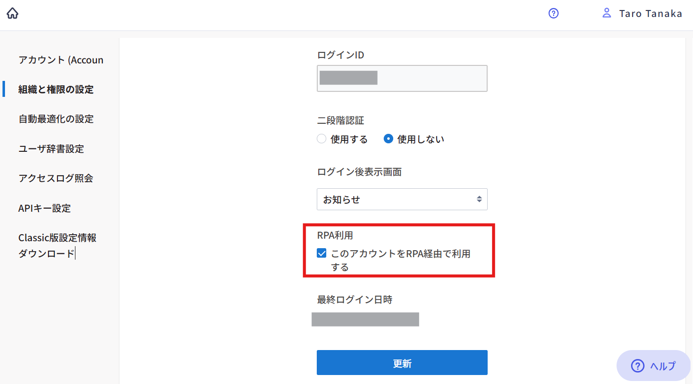 RPA経由でご活用されているアカウントは、リリース後、「RPA利用チェック」を有効にしてください。