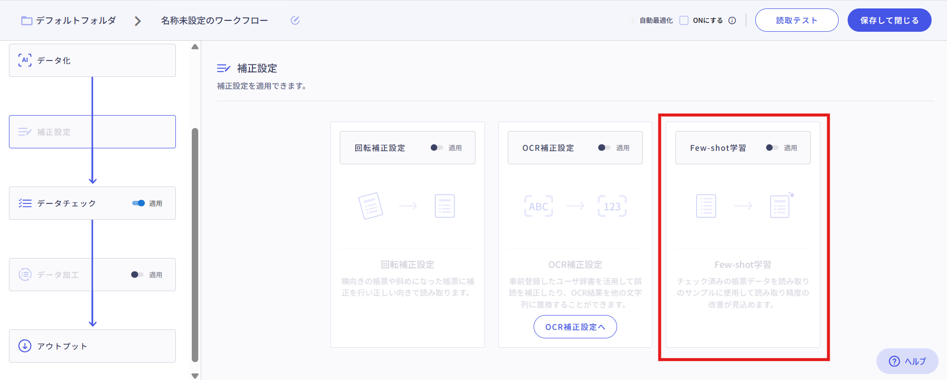 ワークフロー編集画面の「補正設定」から、Few-shot学習をOFFに切り替えます。