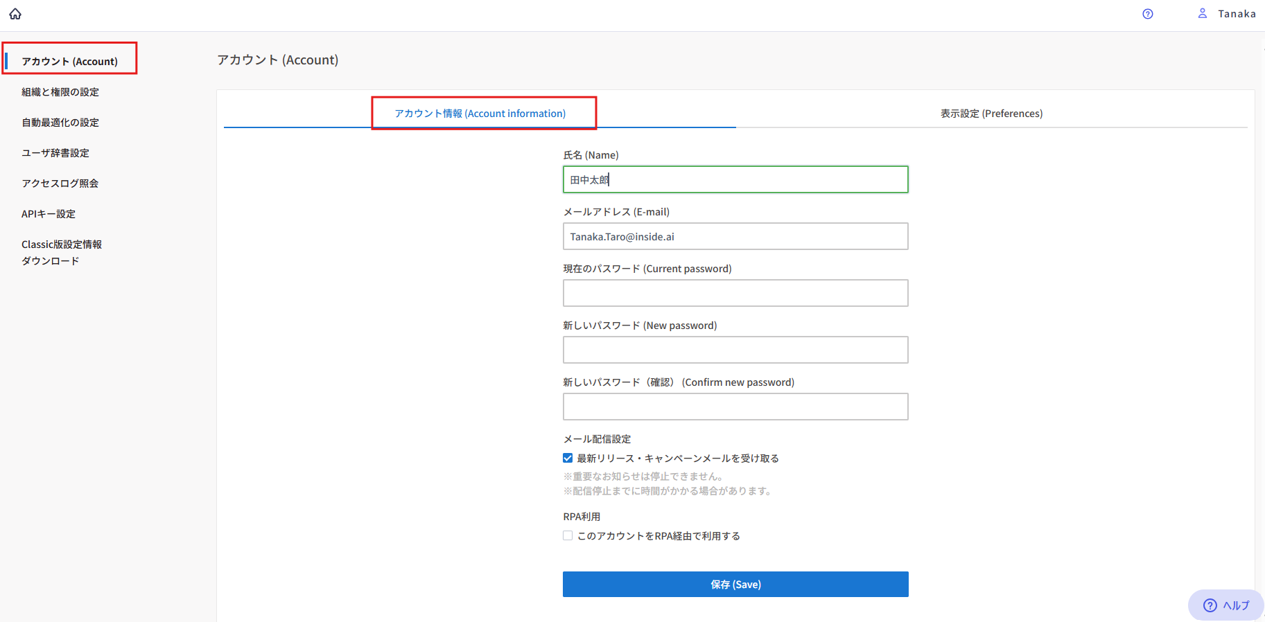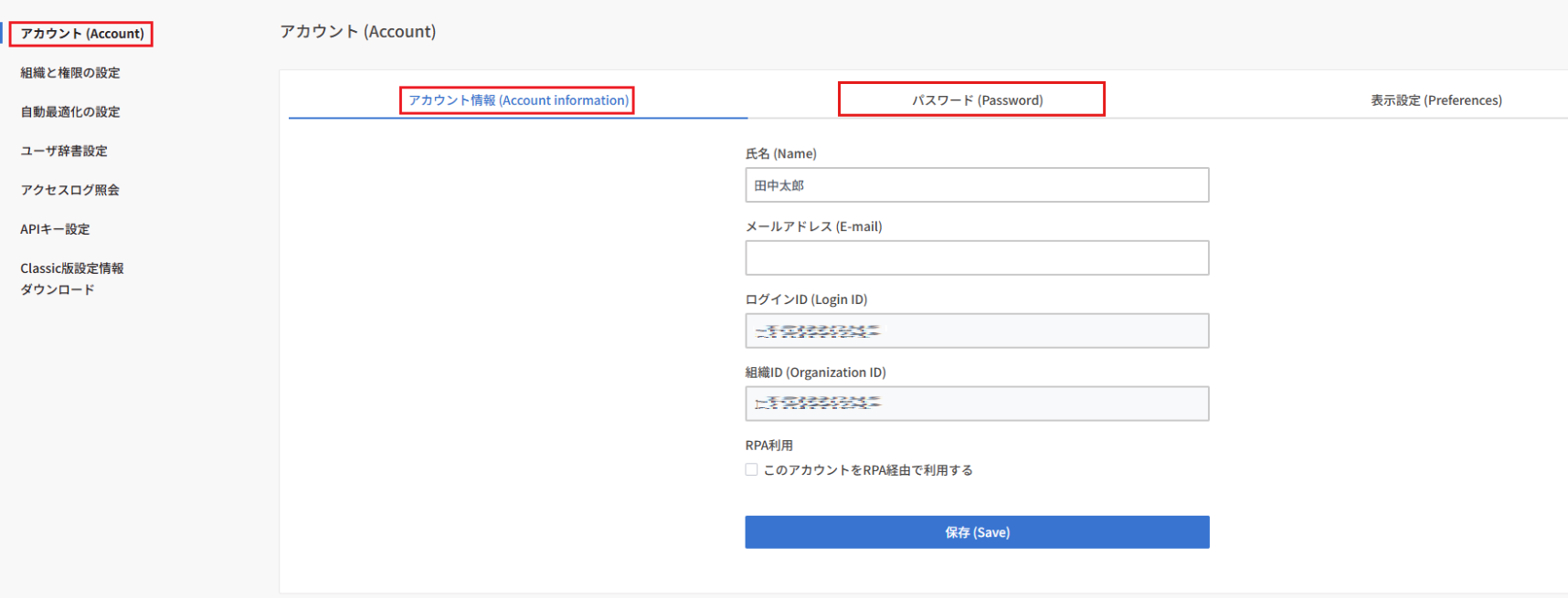 「アカウント情報」画面の中で、メールアドレス登録、パスワード変更、メール配信設定、RPA利用チェックなどを設定いただけるようになりました。